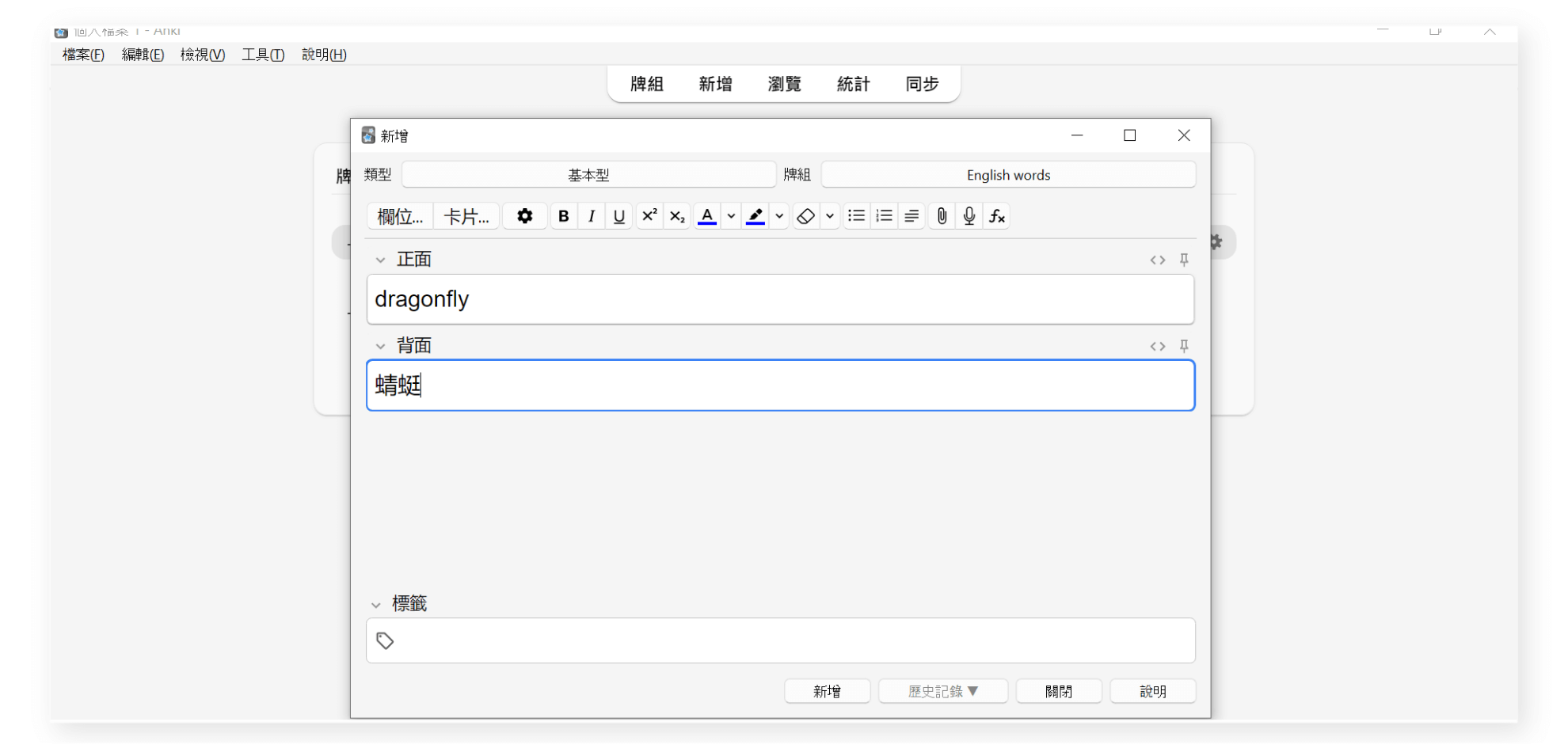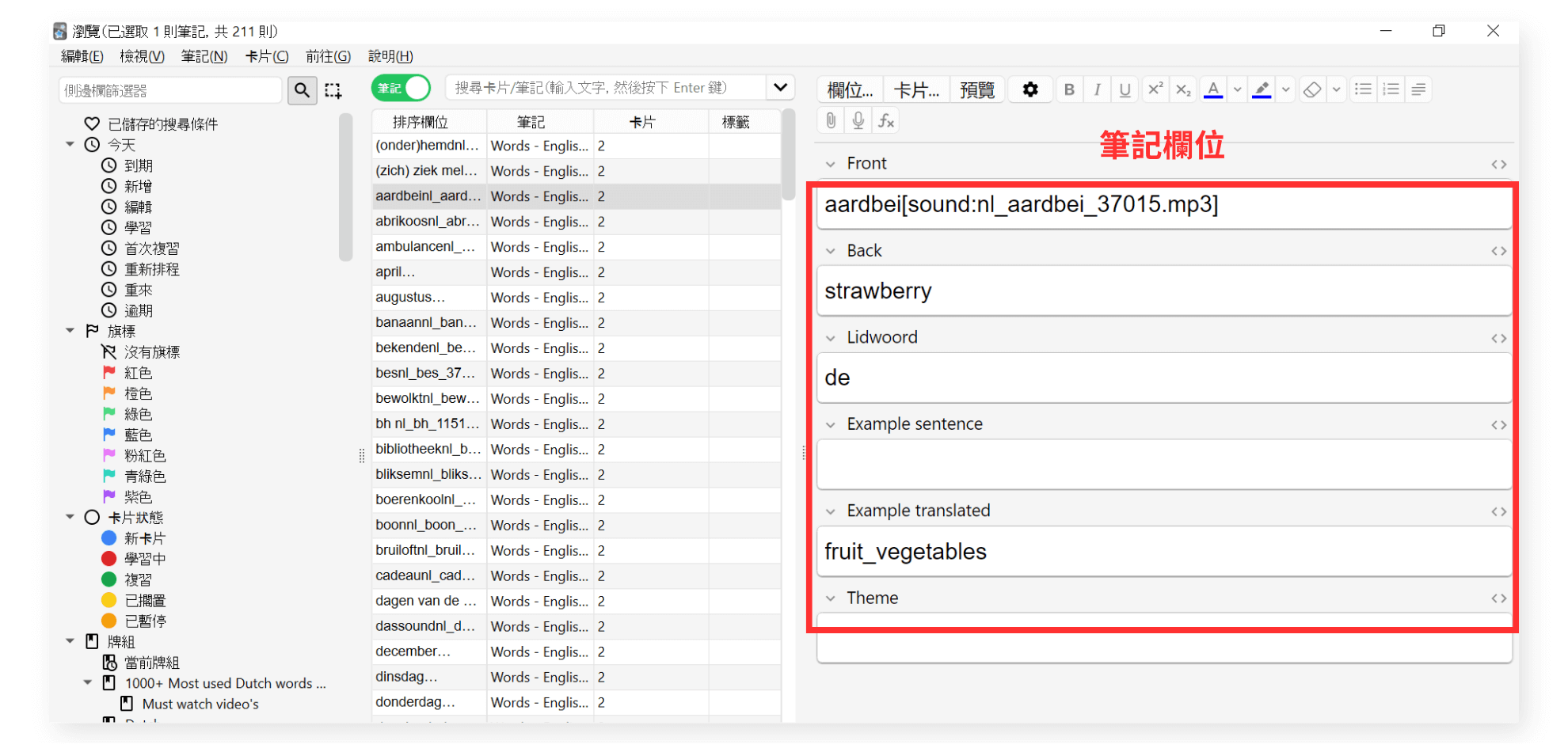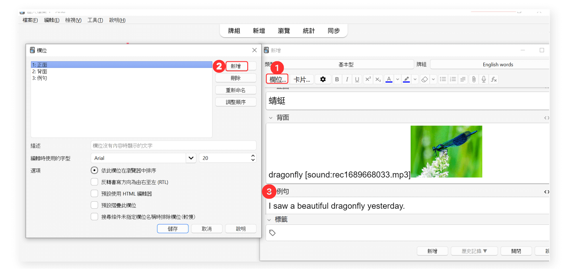 你也可以點擊欄位,新增其他你需要的項目在卡片裡面,比如:例句。