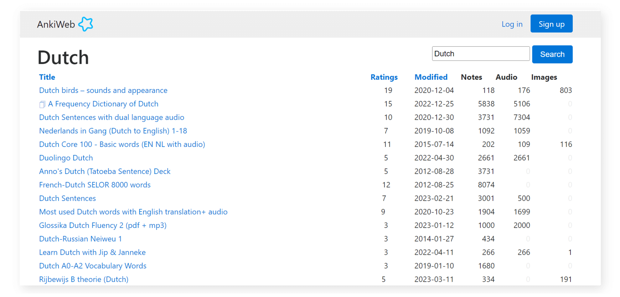 - Anki Shared Decks:Anki 官方的共享牌組平台,所有使用者都可以在這裡上傳和下載牌組,你可以透過搜尋功能尋找特定主題的牌組,並且查看其他使用者對這些 牌組的評分和評論。