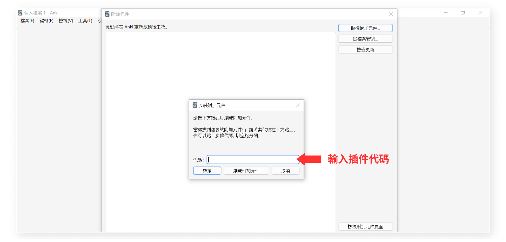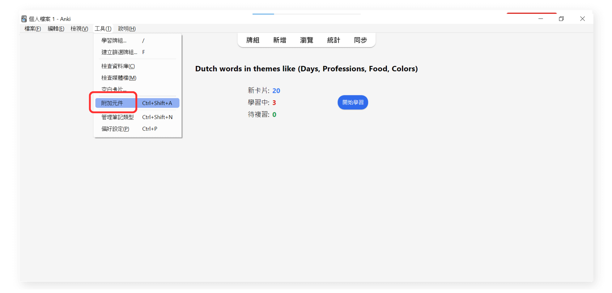 在 Anki 主頁面上方工具列選擇「工具」-「附加元件」。