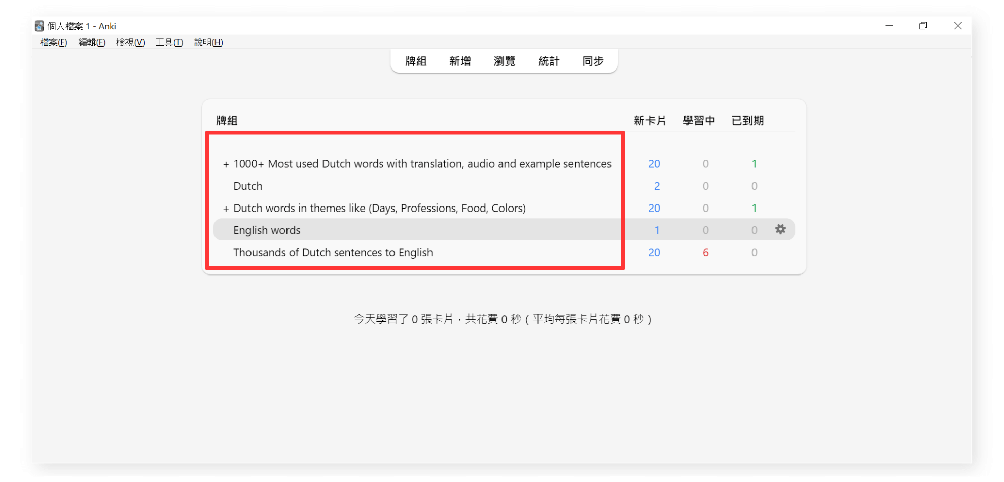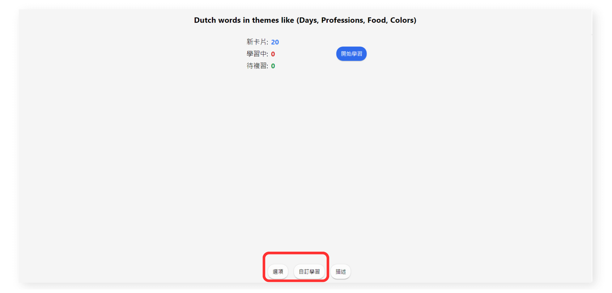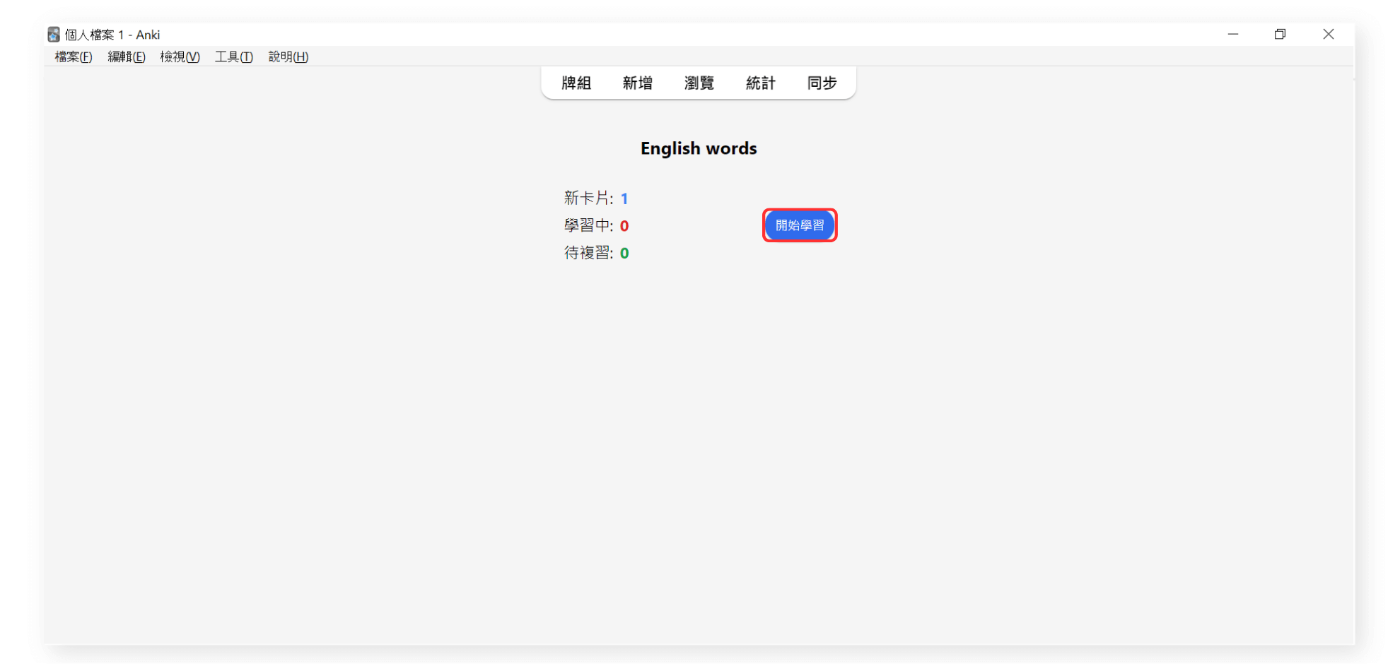 點擊「開始學習」。Anki 會用不同顏色的數字來區分卡片,例如:藍色代表新卡片、紅色代表學習中的卡片、綠色代表要複習的卡片。