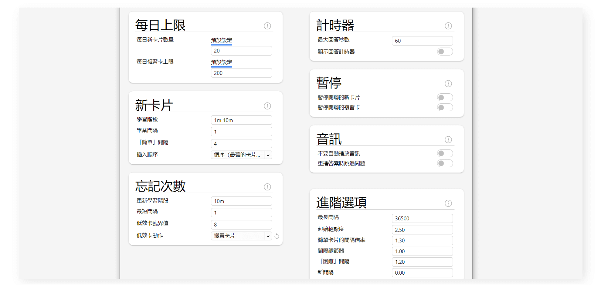 - 按自己的喜好客製化:Anki 提供了豐富的配置選項,讓使用者可以根據自己的喜好和學習風格進行個人化設定,你可以調整卡片的顯示方式、記憶強度的計算方式、記憶間隔的長度等,讓你的學習方式更符合自己的需求。