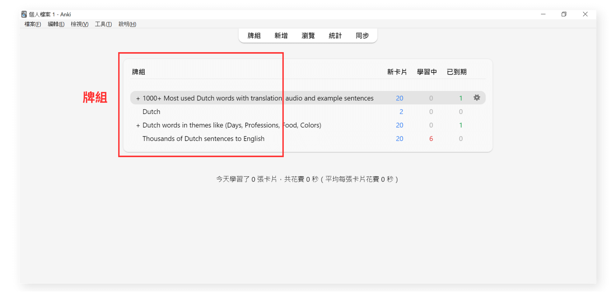 牌組是 Anki 系統裡最大的單位,用來分類跟組織卡片的容器,可以想像成一個大抽屜,有不同的主題集合在一起,比如「語言學習」或「醫學知識」,裡面能建立和管理多個筆記和卡片。