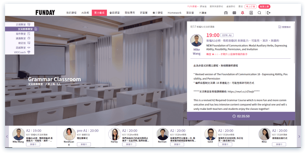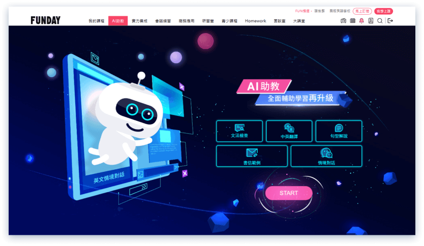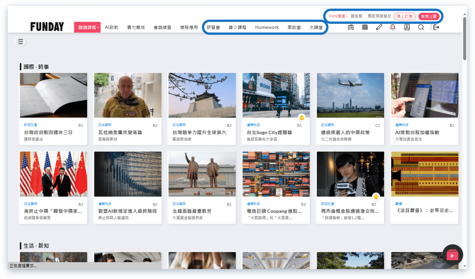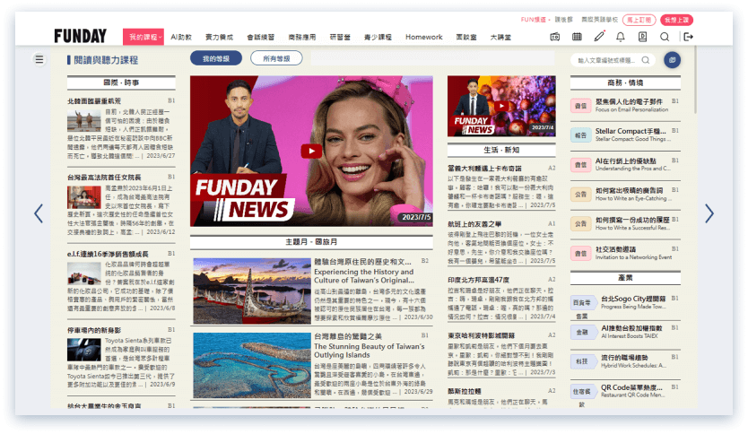 FUNDAY 線上語言學習平台功能很多,主要有五大項: