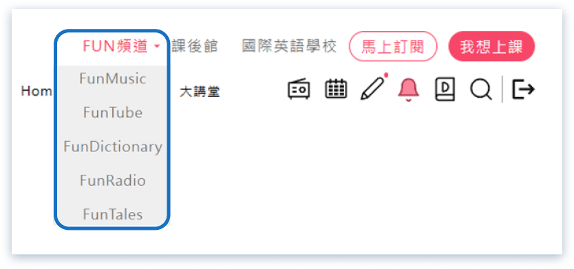 同時,也可以點選右上角「FUN 頻道」,內容會有 FunMusic、FunTube、FunDictionary、FunRadio、FunTales,提供的學習資源有: