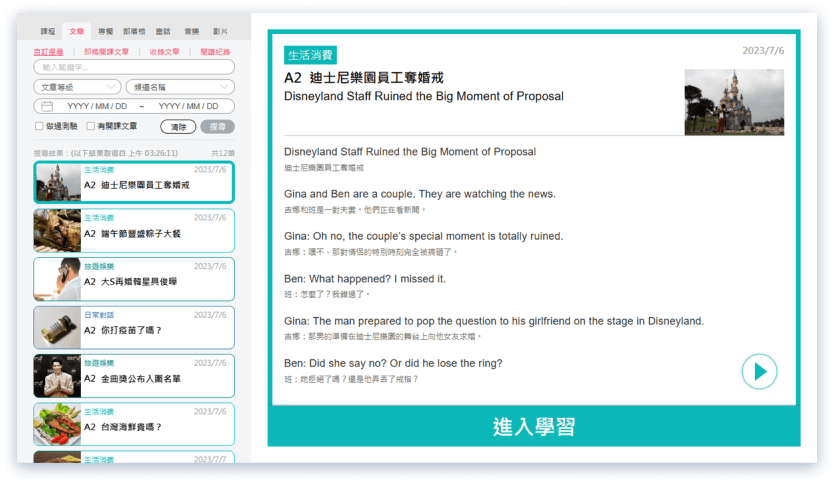 另外,可以點選首頁工具欄位的「聽讀課程」,裡面的學習資源是依照主題分類,例如:國際時事、生活新知、商務情境、看影片學英文、童話故事、唱歌學英文、雜誌,適合通勤的上班族使用。