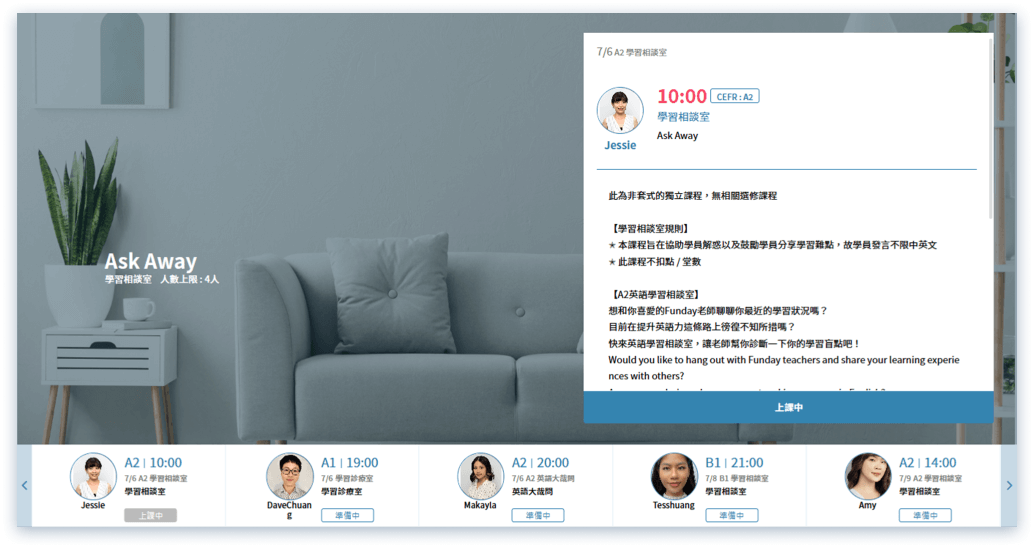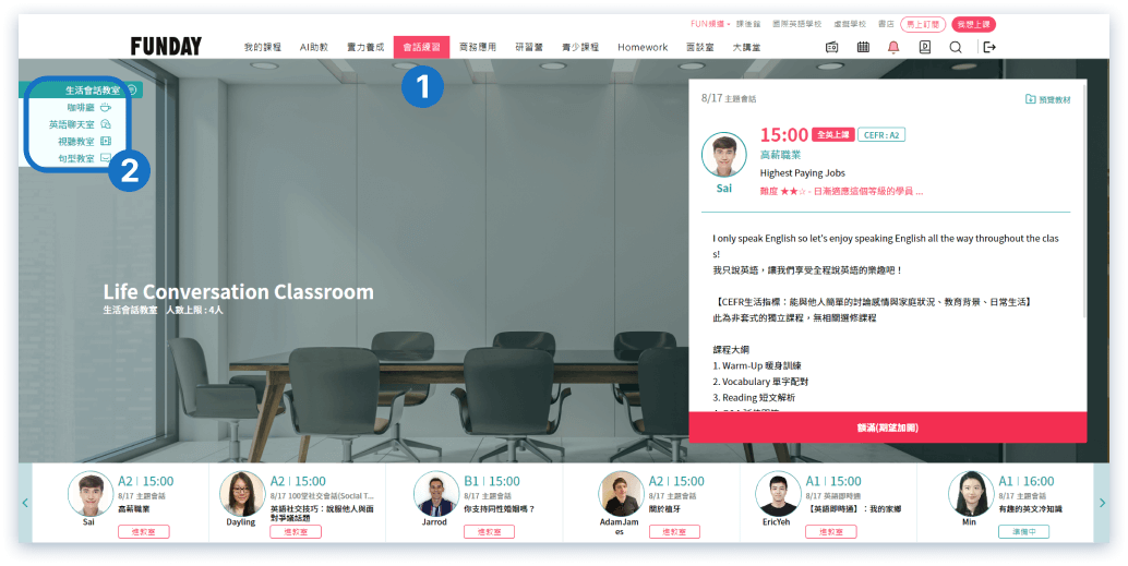• 面談室:專為 FUNDAY 學員所設置,學員可以直接向上課老師提出英文問題。