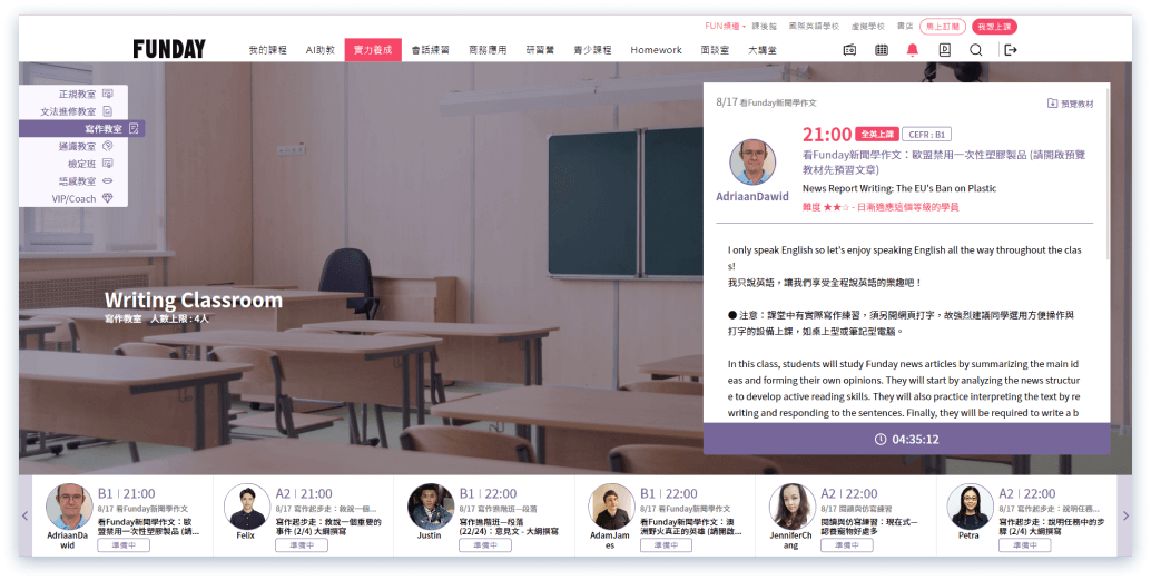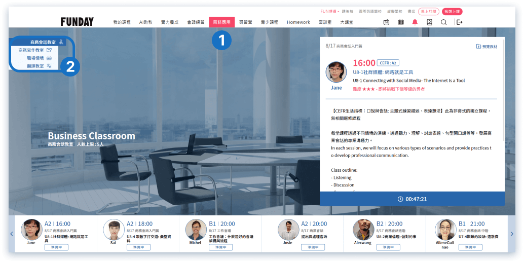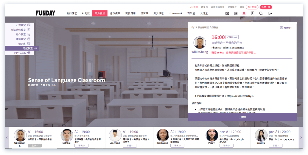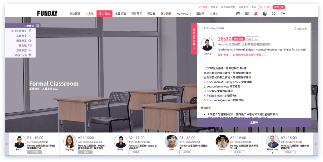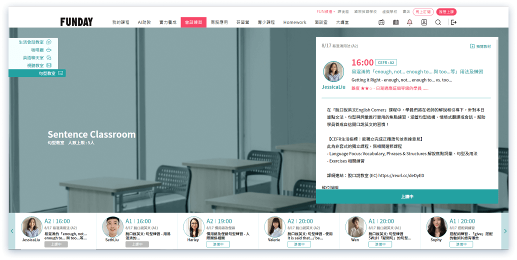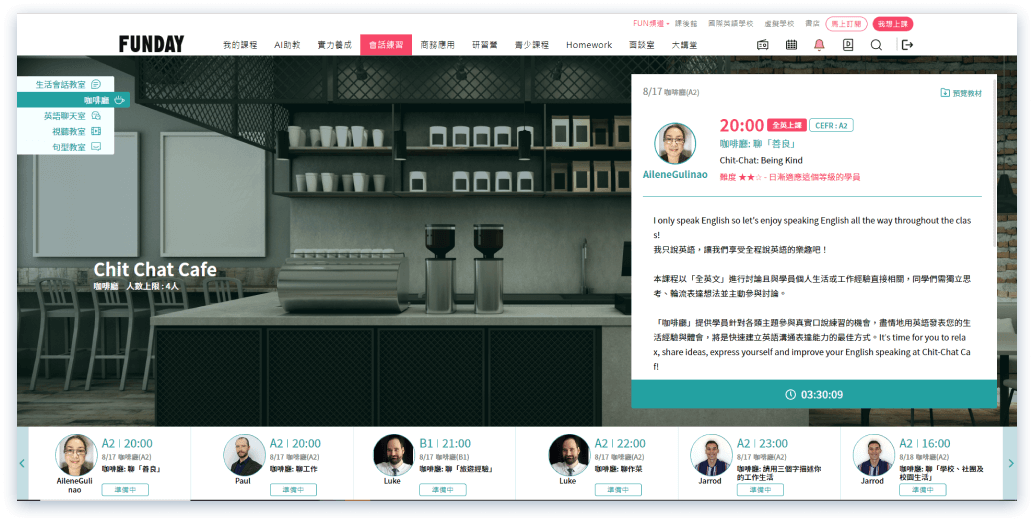 FUNDAY 所提供的課程及學習教材,是我體驗到現在的線上英文平台中最清楚詳細的,可在官網看到上課老師、上課教材及學習指標,與主要課程無關的功能會於「其他功能」介紹。