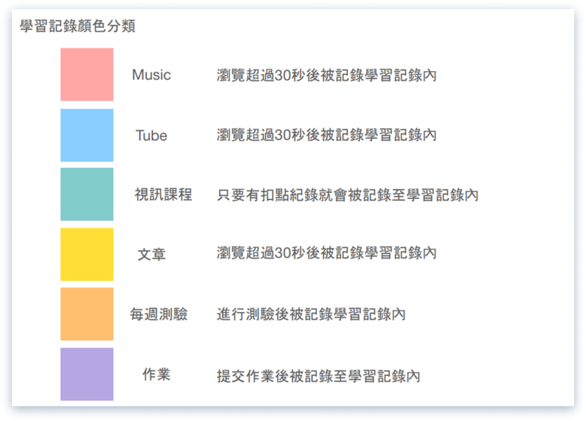 右側學習列表則為呈現過往 3 個月內的學習紀錄 ( 可篩選分類 ),使用教材若有超過指定時間會被紀錄在行事曆及學習列表內,顏色分類如下圖: