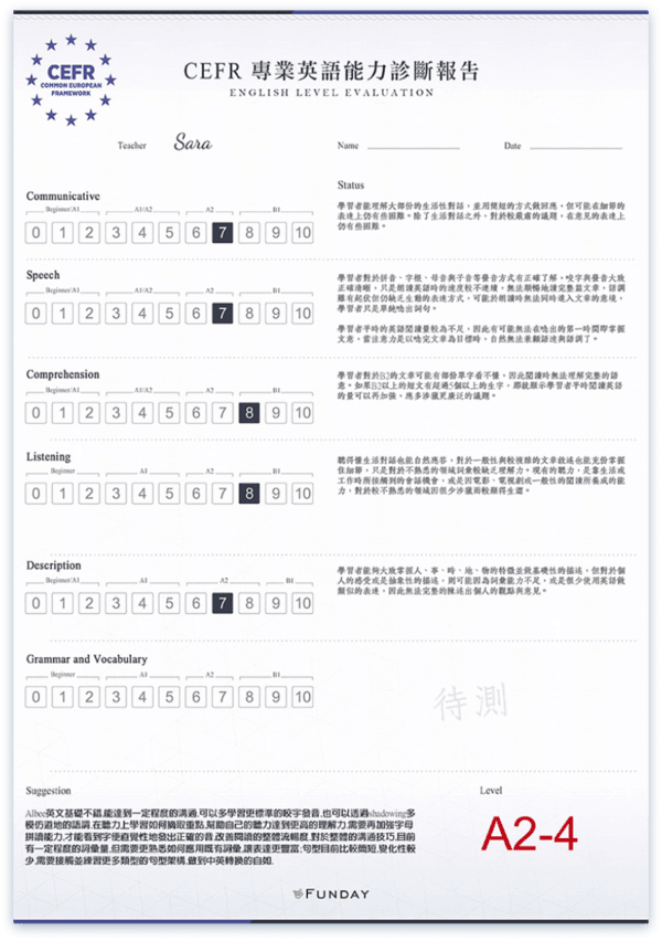 關於 FUNDAY 英語能力診斷報告內容及 CEFR 測驗,後續在等級分析會有更詳細的說明。