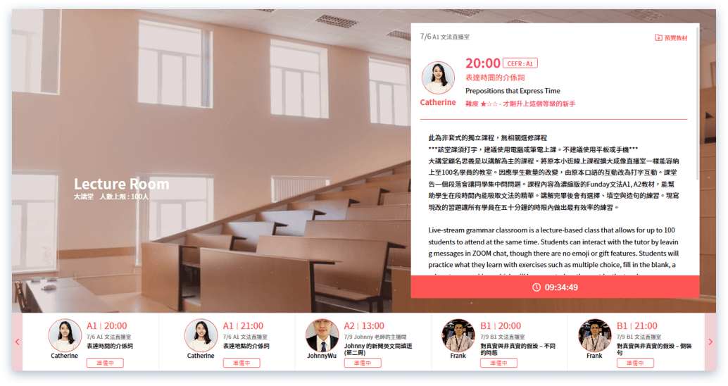• 大講堂:由老師單向講述的直播課程,主要透過文字訊息與老師進行互動。