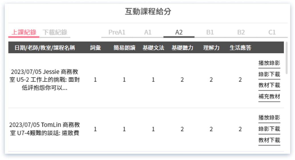 ● 即時視訊課程:1~5 人小班課程,可下載上課錄影檔。