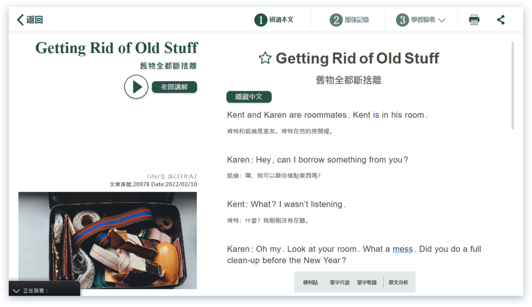 • 聽讀會話:輪流扮演文章中的角色,老師會補充文章有出現的詞彙及片語。