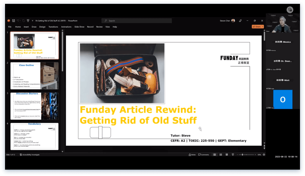 老師引導同學討論「舊物段捨離」的問題,採用輪流回答的方式,每位學員都得用英文說出自己的經驗,而老師會用文字打下同學的回答並擴充相關問題,來增加學員與他人對話的詞彙及構句能力。