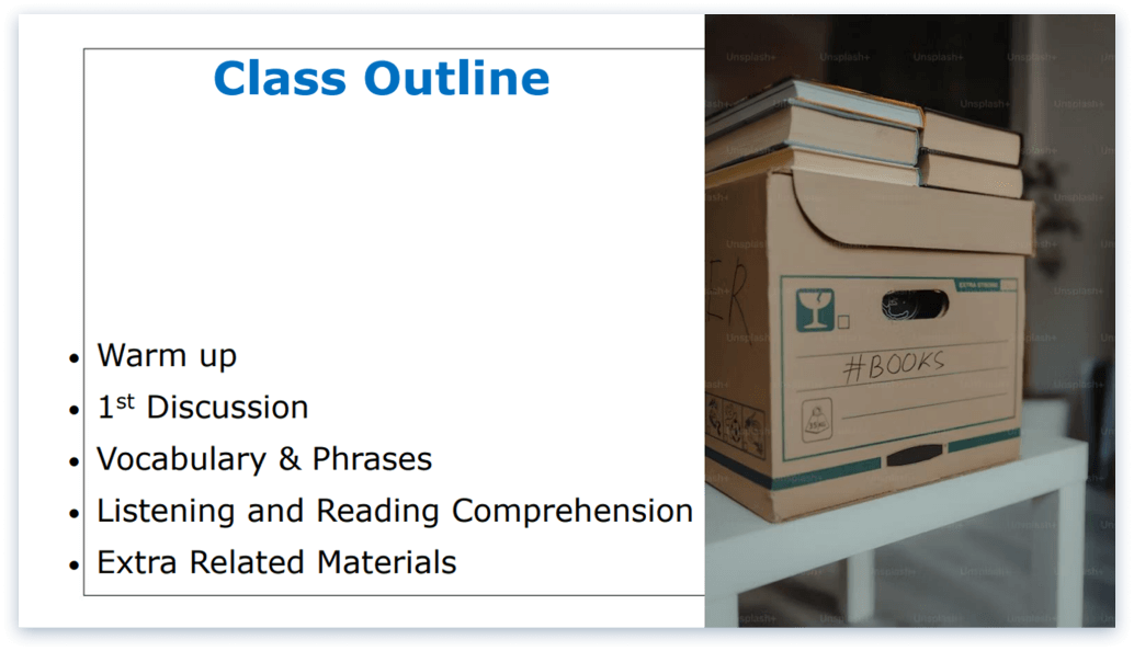 正規教室的上課內容,簡單來說就是透過開口說的方式來複習文章,會有討論、朗讀會話的練習,每堂課程的老師上課風格都不太一樣 ( 下面提供課程大綱給大家參考 ),上課中老師採以輪流的方式發言,實際上課流程為: