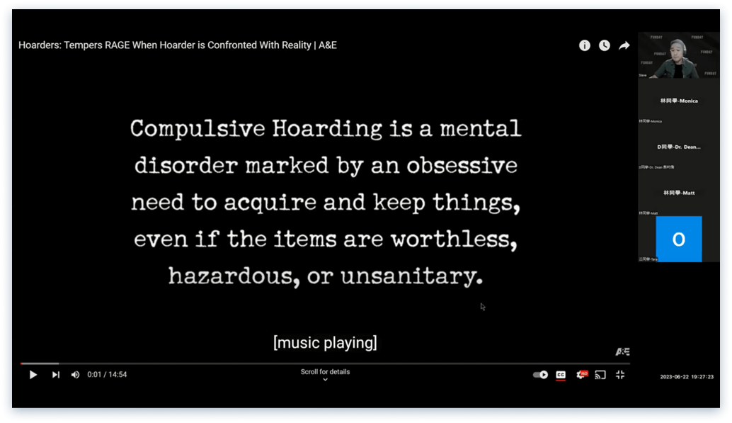 討論到聽讀會話的段落,剛好有提到「囤積症」,老師找了 “Hoarders: MASSIVE Hoard Overflows Down to the Driveway” 來輔助我們理解,影片沒有中文字幕,對於我來說會有些吃力,有些段落老師會額外用英文進行說明。