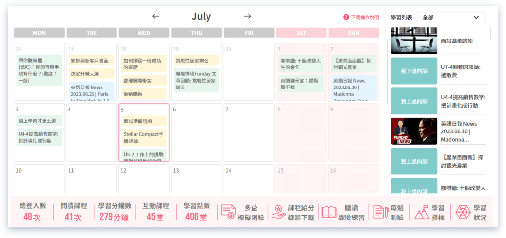 ● 多元課程:包含專欄、每週測驗、音樂盒、學習影片、多益模擬題庫、個人學習紀錄與能力指標功能。