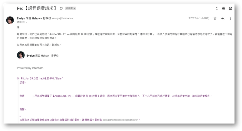 大約十幾分鐘後,就收到回信,表示已經成功幫我退費。在這部份不得不說,是我目前使用過的線上課程平台中,退費最迅速的一個。