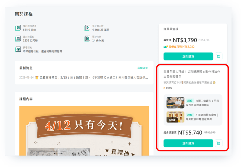 在銷售頁面的右側,系統就會自動詢問你要不要跟另外一堂課程合購,也會顯示合購的價格。目前看到的大多都是兩堂課合購,我還沒有看過有超過兩堂以上的課程可以同時合購的。