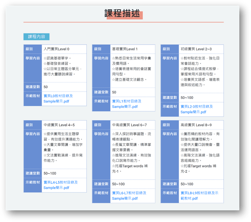 - 難易分級明確:不同課程都有對應的級別與教材,無論是一般、商用或考試都有。