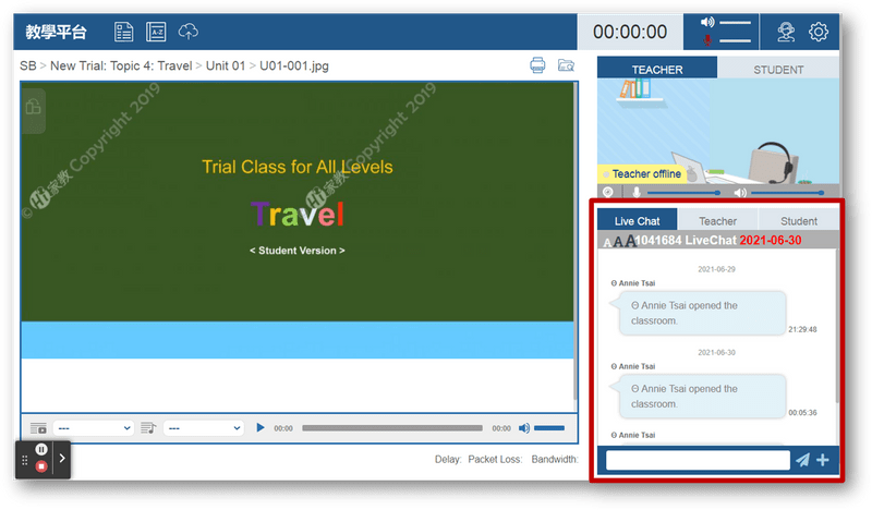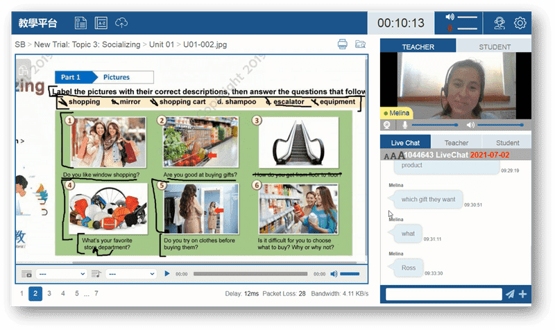 我實際上課的時候是在平台操作,側邊有留言板老師會打上你不懂的詞彙或是要你仿說的句子,整體使用起來很流暢,不會卡卡的。