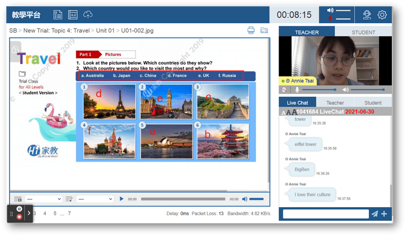 基本上詞彙及閱讀大致上我都沒有問題,老師在過程中會詢問你圖片中有什麼,請你盡量用英文表達你看見的東西,例如:雪梨歌劇院、大笨鐘、萬里長城等,對於你停頓比較久(不知道怎麼回答)的問題,中師就會以中文來解釋。
