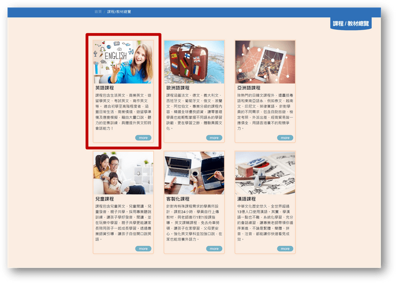 課程教材依學習語言主要區分為英語課程、歐洲語課程、亞洲語課程、兒童課程、客製化課程及漢語課程,本篇主要會針對「英語課程」的部分來介紹。