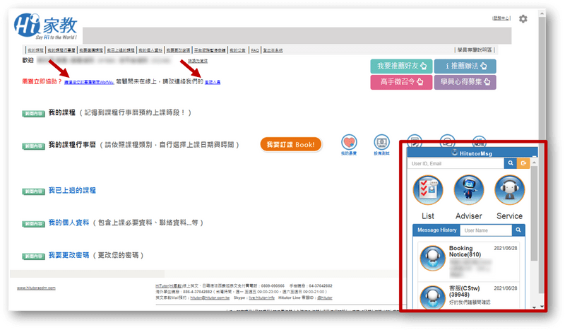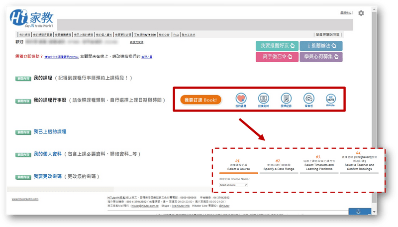 Hi家教有自己專屬的線上平台,基礎功能主要是「預約課程」和「客服聯絡」兩種,整體平台風格的設計還陽春的,與官網的設計落差超級大,呈現資訊有: