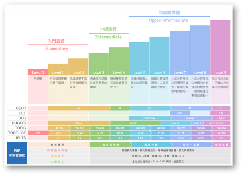 共有 9 個等級,區分為入門基礎、中級課程以及中高級課程 (見下圖),大致與 CEFR 分級制度一致,初次試聽老師會依據發音、字彙、文法、口說、聽力、閱讀進行簡易的語言能力評估。