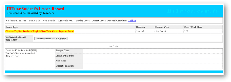 除此之外旁邊還有設備測試、授課紀錄及留言板功能可以玩玩看,我個人覺得最重要的「授課紀錄」的部分,雖然 Hi 家教沒有課程錄影的服務(有錄音),但還是可以簡單看到老師給予的回饋,學生端也可上傳自己想學的教材。