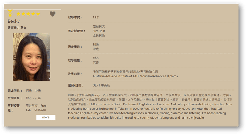 依據個人偏好篩選出適合的上課老師後,可在老師資料上面了解教學年資、可教課程、適合學員、教學風格、教學背景以及中英文自我介紹,雖然不比短片介紹來的詳細,但師資資料算是蠻透明的。