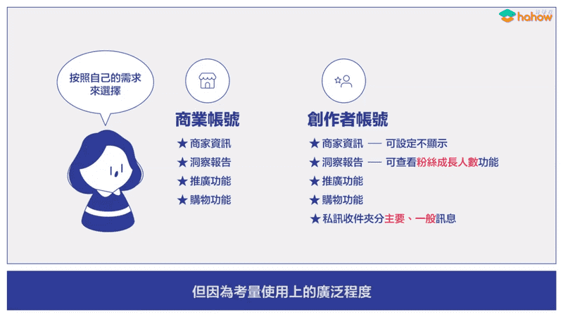 考量 IG 商業帳號使用的廣泛性及第三方串聯工具的方便性,在 IG 全攻略課程中會以「商業帳號」進行說明,其帳號差異可以參考以下的圖文,依自己的需求來選擇。