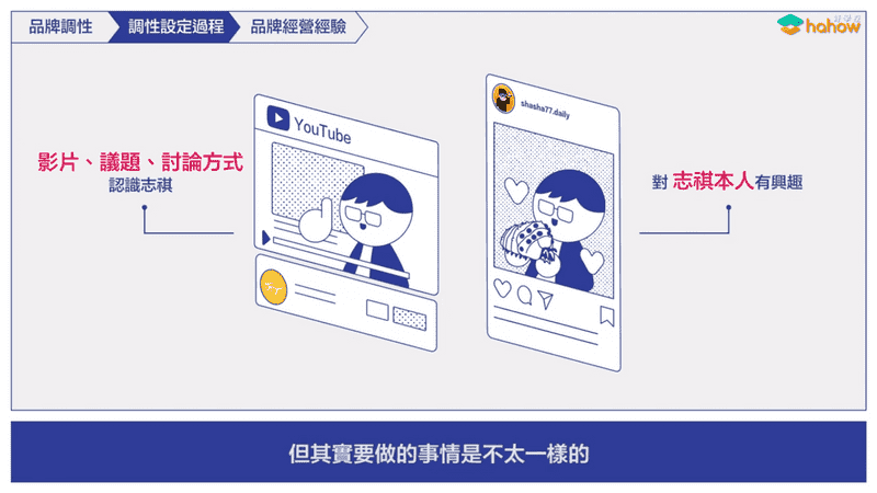 志祺 77 有特別提醒,建立一般品牌與個人品牌是不同的,比如說 「一般品牌」主要是藉由影片中的議題分享、討論等方式來認識他;而「個人品牌」主要會以張志祺本人為主。