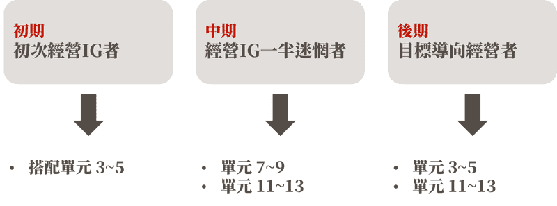 • 初期 IG 經營者:搭配單元 3~5 ,先初步認識 IG ,做好前期的目標及策略擬定。