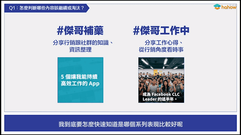 接著【內容執行篇】可以知道透過 IG 內容發佈工具的功能,針對工具的特性去發佈適合的內容,也知道透過不同的創意玩法可能會提升粉絲的互動頻率,但沒有一個完整且有系統的方法,必須自己觀察數據來判斷該如何做。