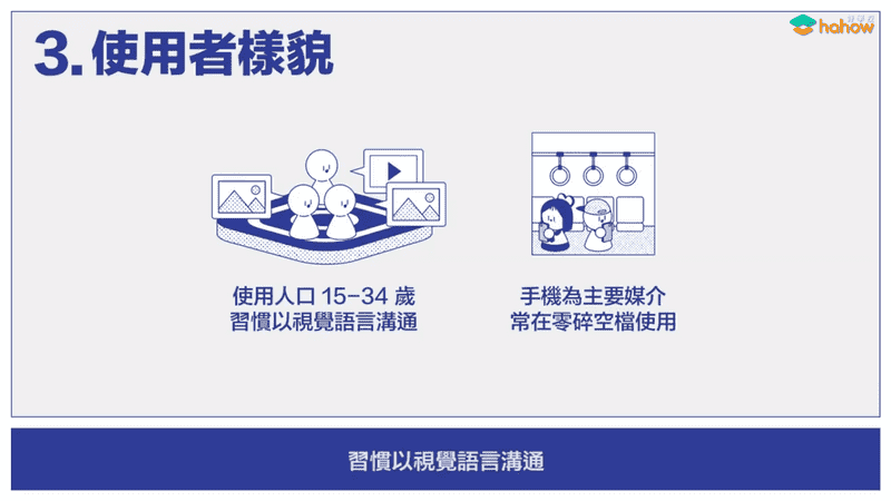 像是你可以知道 IG 使用年齡為 15~34 歲,且多數人都以手機在零碎時間使用為主。