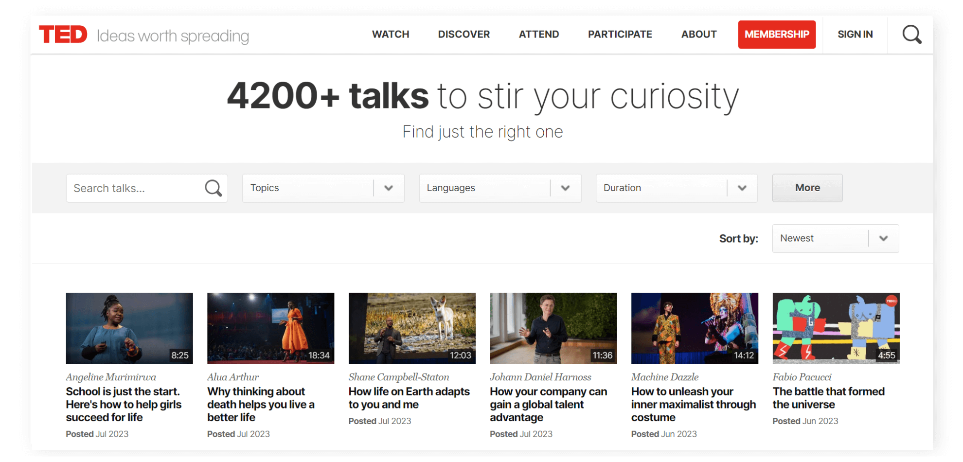 進入 TED 官網後,點擊選單上方的 WATCH,再選擇 TED Talks,即可看到 4200 部以上不同主題的演講影片,透過影片上方搜尋列,能依照喜好或需求搜尋關鍵字,以及選擇主題、語言和影片長度。