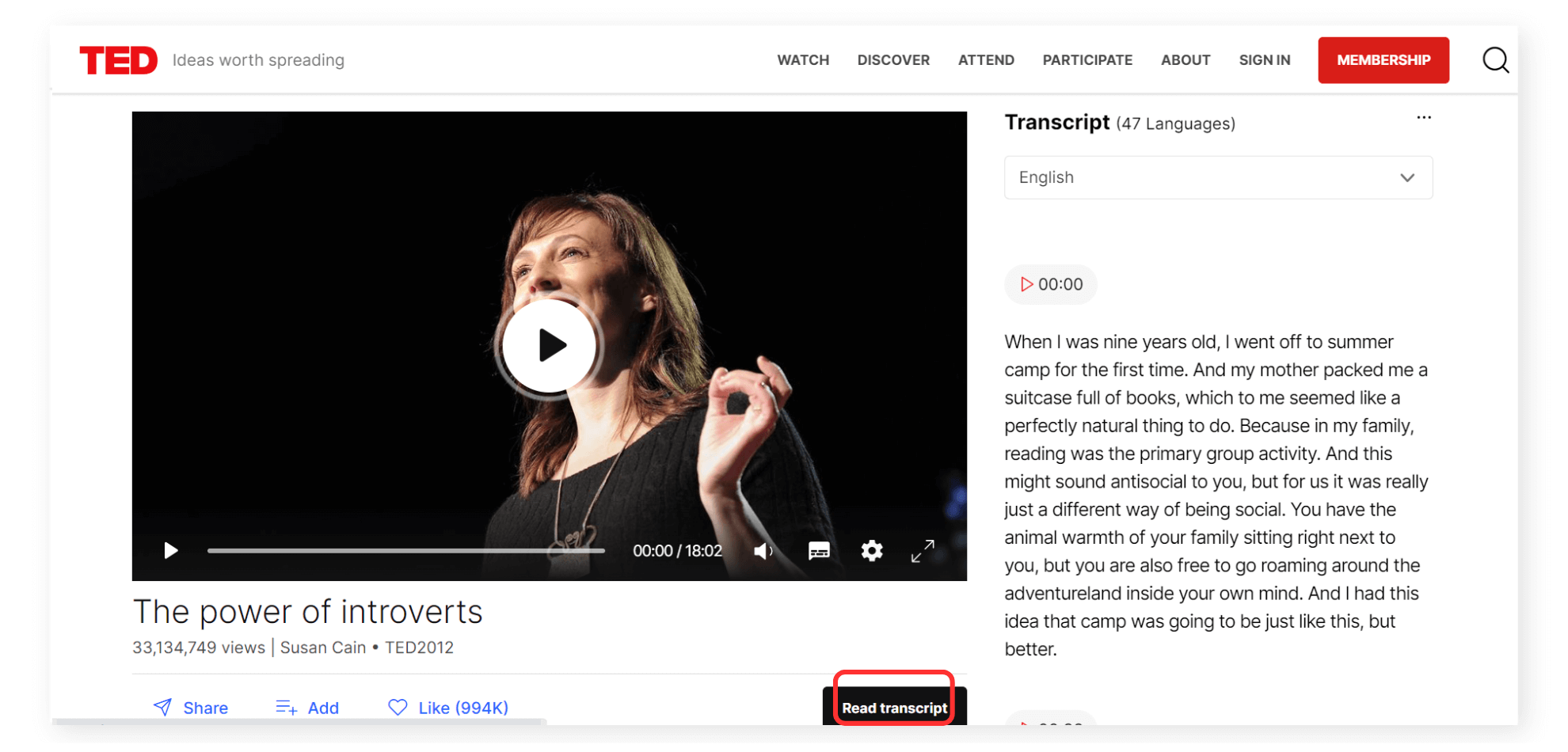 看 TED Talks 學英文的時候,其實有不少因素要考慮進去,除了最主要口音的差異外,有的講者語速較快,有的講者則會使用較為艱澀的用字,每個講者的表達方式多少還是有些差異,因此,你可以直接點擊影片右下方的 Read transcript 按鈕,以閱讀文稿的方式來理解演講內容。