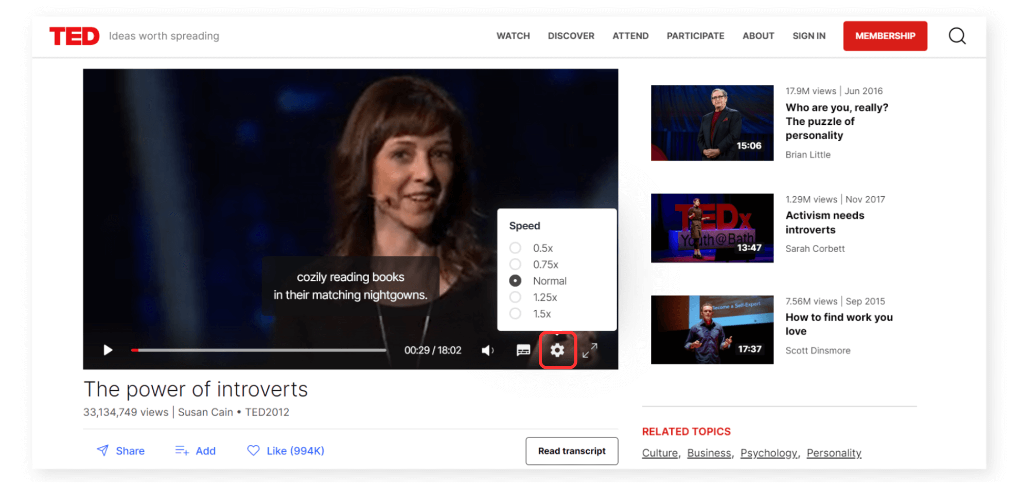 • 從較短的影片循序漸進:在眾多的 TED Talks 資源裡,你可以找到不少短於 18 分鐘的影片,當你適應了每位演講者的語速後,你就能挑戰自己觀看更長的影片。盡可能讓學英文的過程變得簡單,如此一來,你會更有動力長期執行下去。