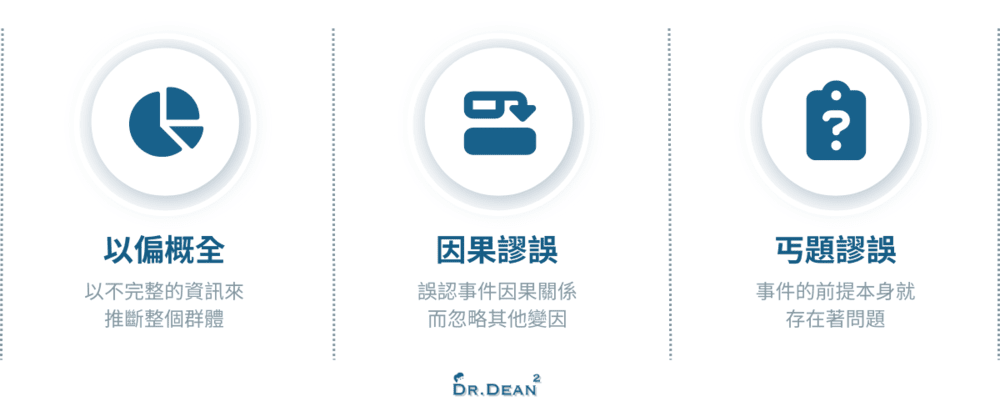 課程指出,觀點推導的過程可能會出現多種謬誤,這裡介紹在時事上最常見的 3 種: